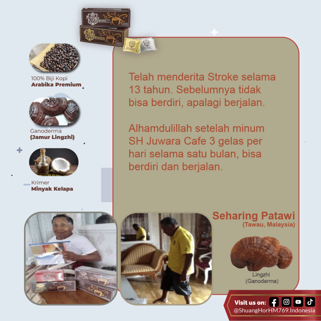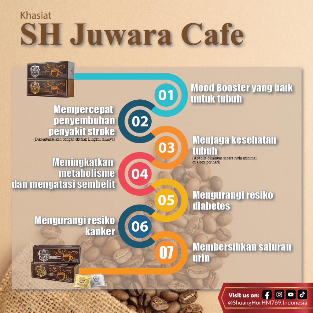 Rasakan berbagai manfaat kesehatan dari SH Juwara Cafe yang terbuat dari Ganoderma, 100% Biji Kopi Arabika serta Krimer Nabati yang terbuat dari Kelapa